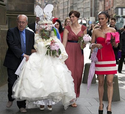 Жених Элейн Дуглас Уотсон предстал в классическом костюме, а подружки невесты – в розовых платьях. Несмотря на странноватый вид невесты, жених выглядел по-настоящему счастливым.