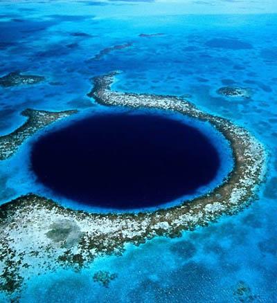 За пределами Белиза, страны в Южной Америке, находится практически идеально круглая Большая голубая дыра, диаметр которой составляет 0,4 км. Глубина воды в этой дыре - 145 м, что придает ей глубокий голубой цвет.