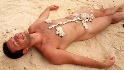 30-летний актёр полностью обнажился и лёг на песок, а интимные места ему закрыли ракушками, точь-в-точь как в прошлом году это сделала отдыхающая на Мальдивах Волочкова.