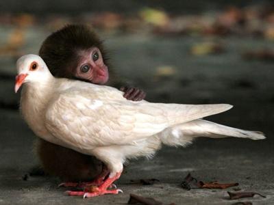 Осиротевшая макака-резус и потерявший свою голубку белый голубь подружились в национальном заповеднике в Китае.