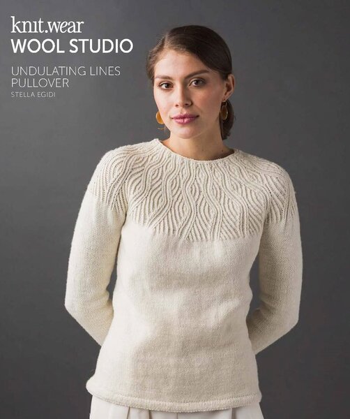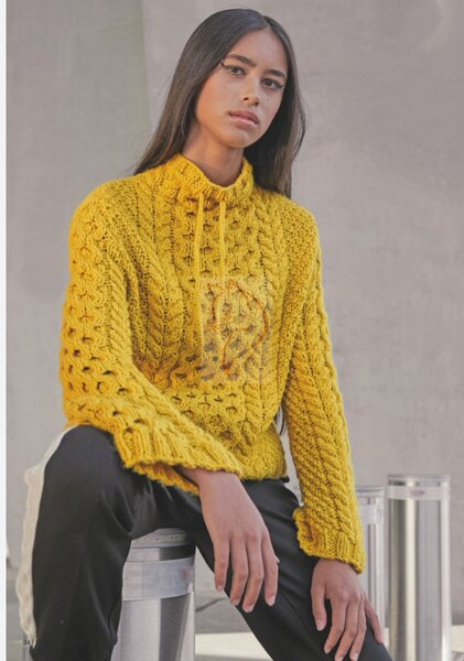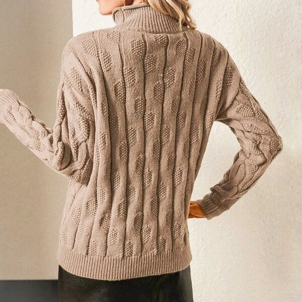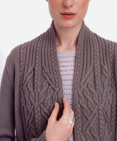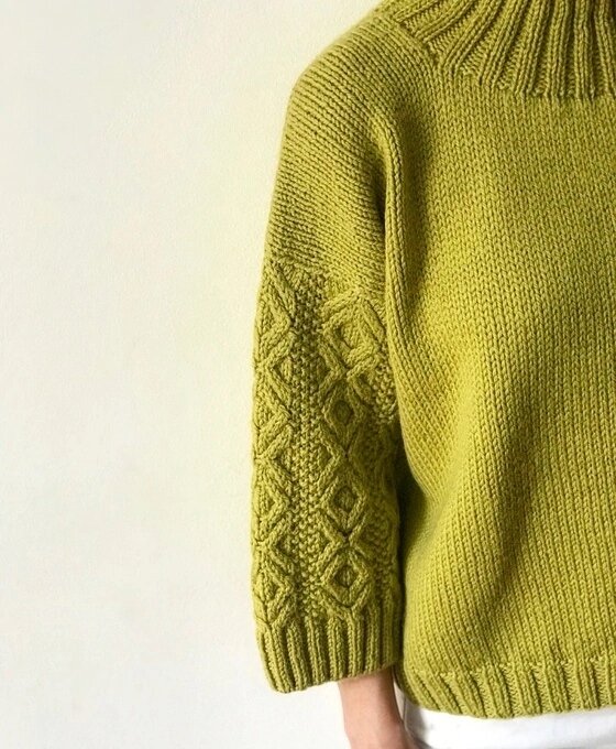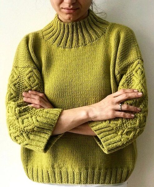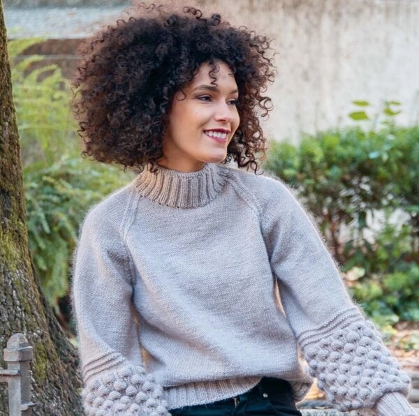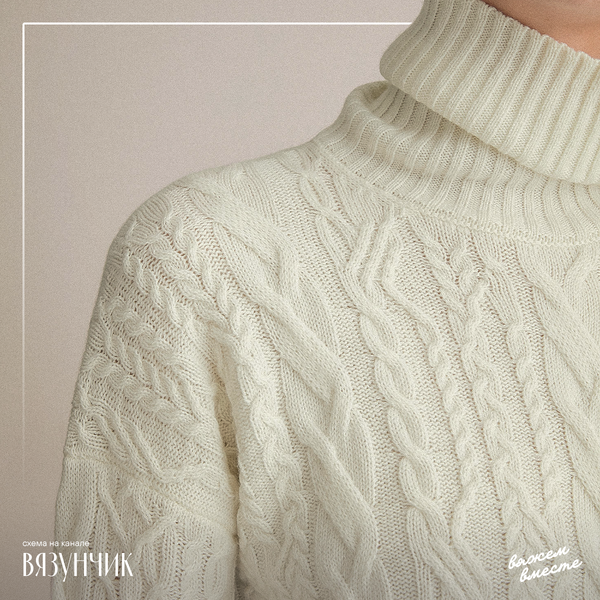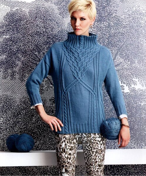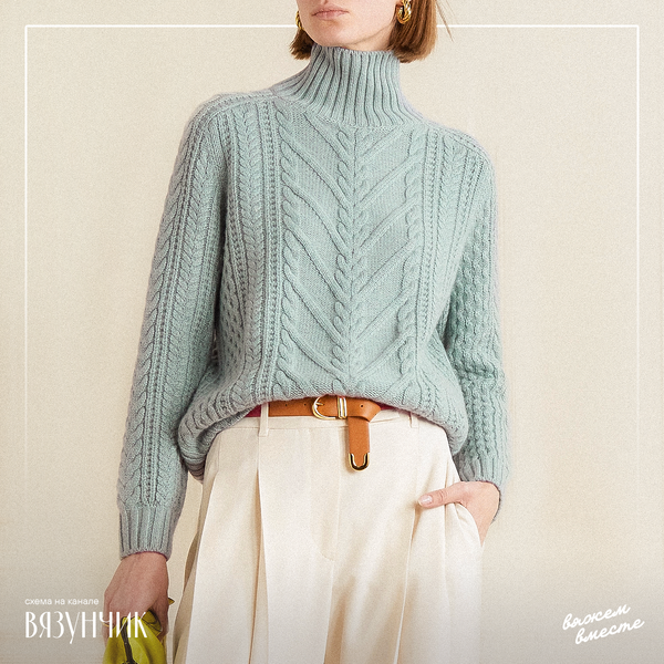 Третья по счёту модель — дымчатый свитер с высокой горловиной-стойкой, украшенный асимметричными косами с элементами лицевой глади и жемчужного узора.