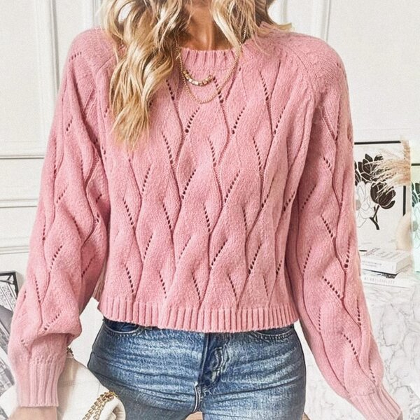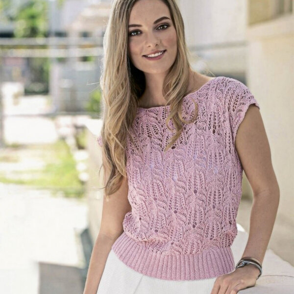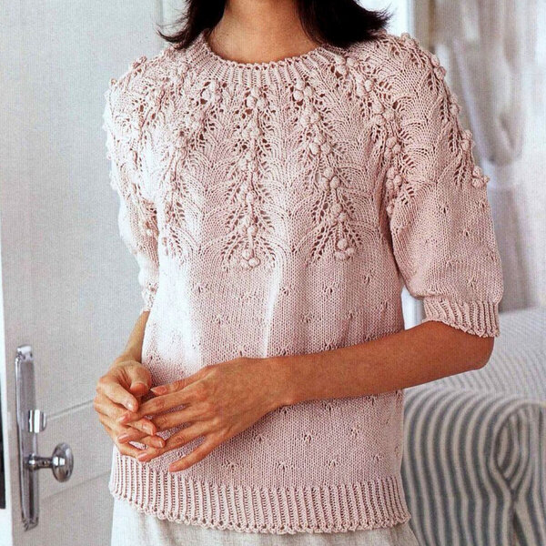 И четвёртое изделие — яркий коралловый джемпер, украшенный красивым рельефным узором с узкими жгутами и плетёным узором.