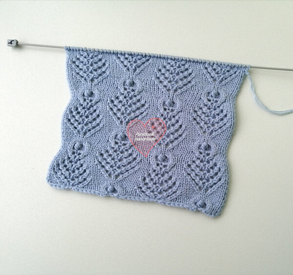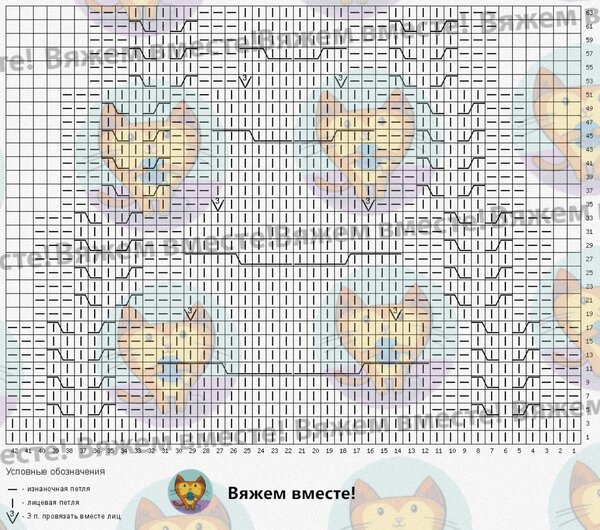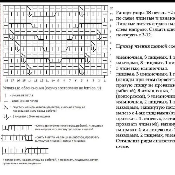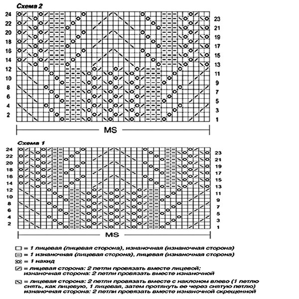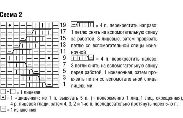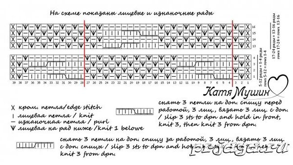 На схеме обозначены только лицевые ряды вязания, чётные вяжутся по рисунку петель на спице.