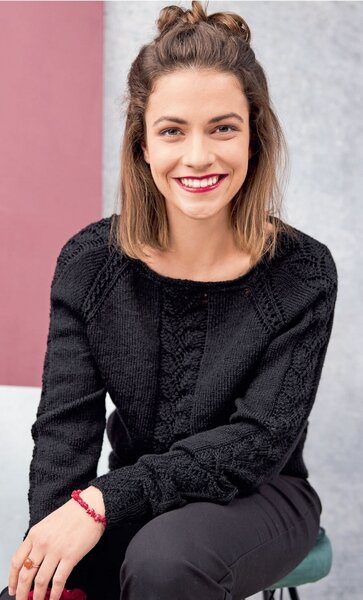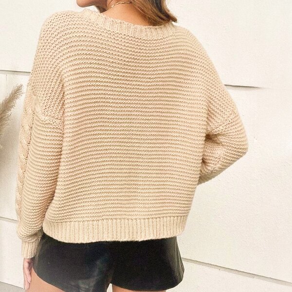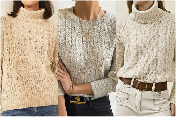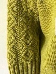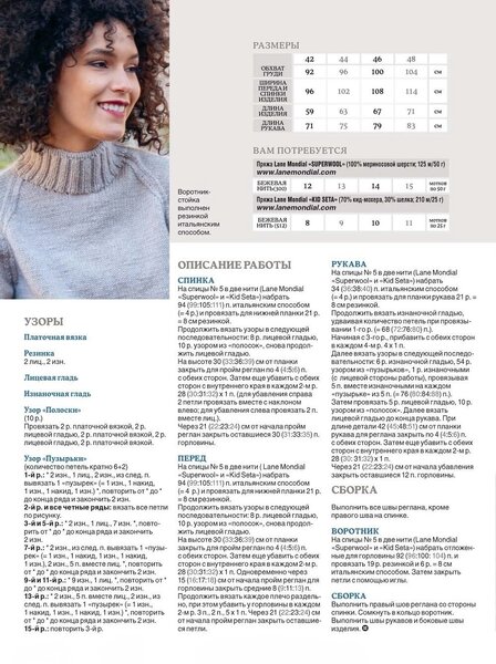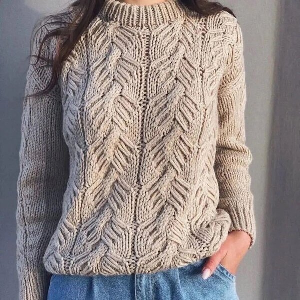 Следующая модель — кремовый джемпер, большая часть которого связана платочным узором (чередованием лицевого и изнаночного ряда между собой) и дополнена широкими вертикальными косами, которые расположены по центру переда и вдоль центральной линии деталей рукавов.