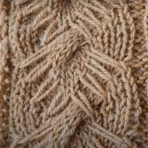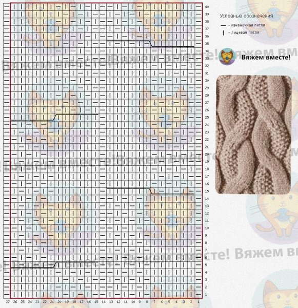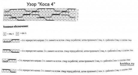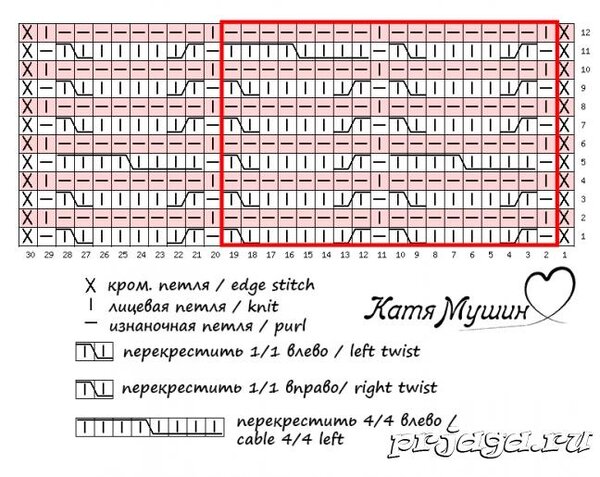 Раппорт жгута равен 12 петлям по ширине и 12 рядам по высоте. На схеме даны только лицевые ряды вязания, чётные вяжутся по рисунку петель на спице.