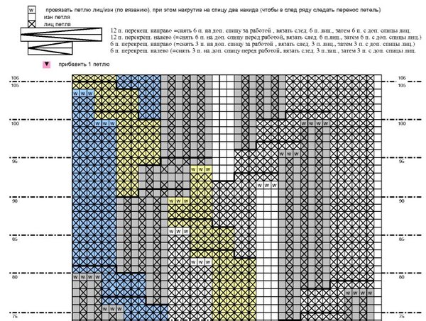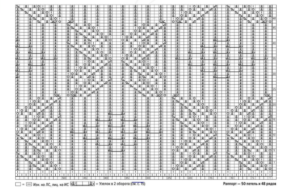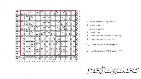 Раппорт узора составляет 23 петли по ширине и 74 ряда по высоте. На схеме петли раппорта выделены краской рамкой.