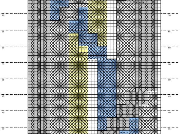 На схеме один раппорт узора по высоте, по ширине раппорт равен 31 петле в основании, далее число петель постепенно сокращается. Направление вязания кокетки — снизу вверх.