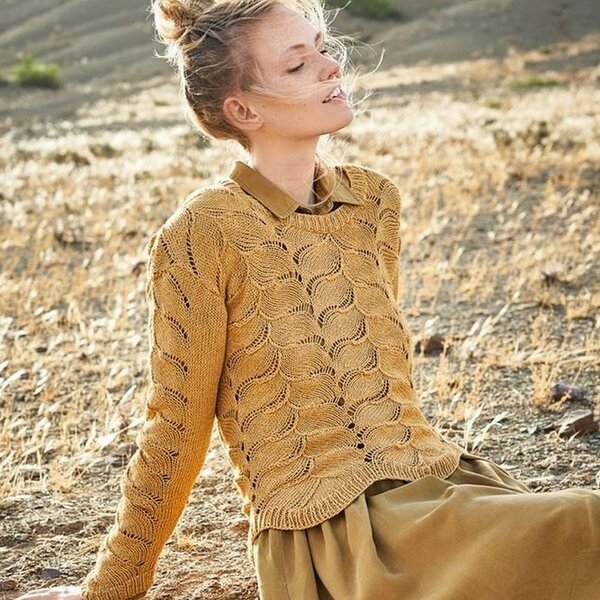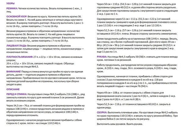 Чтобы связать такой джемпер, нам понадобится 320 (440) гр — на размеры 34/36 (46/48) соответственно — горчично-песочной пряжи: 70% шерсть, 30% хлопок; 40 гр — 124 м. Прямые спицы № 4,5, а также круговые спицы № 4,5.