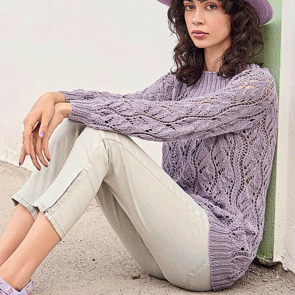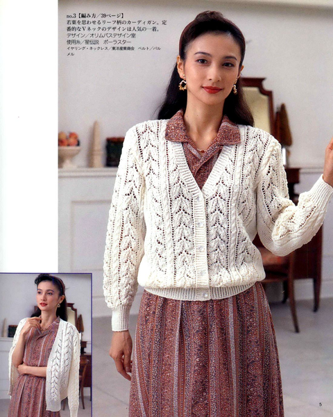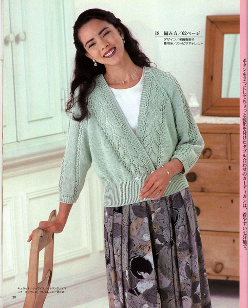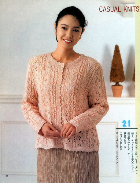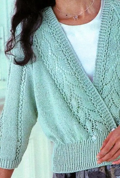 Кардиган с рукавами реглан и ажурными вертикальными узорами по полочкам и рукавами УЗОРОМ ЛИСТЬЯ.