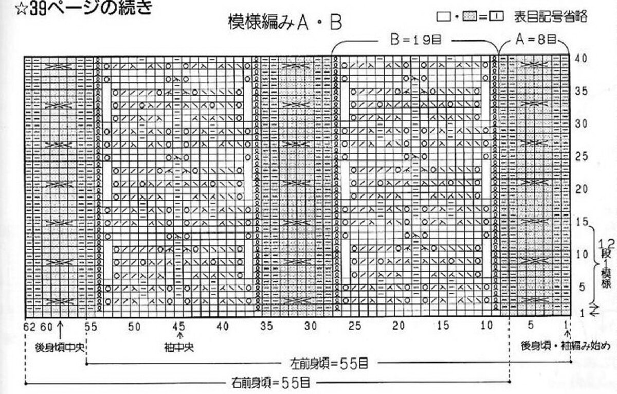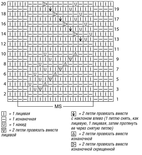 Число петель кратно 15 + 6 = вязать согл. схеме. На ней даны лицевые и изнаночные ряды. Начать с петель перед раппортом, раппорт постоянно повторять, закончить петлями после раппорта. Постоянно повторять 1–20-й ряды.