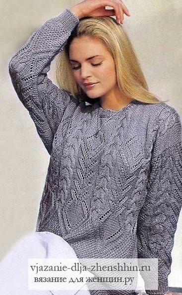 2. Простой свитер в исполнении, а как красиво смотрится. Вяжется он резинкой: 3 лицевые, 3 изнаночные. Можно вязать регланом снизу или сверху. Если вязать снизу, то чуть выше линии груди вяжутся две петли вместе лицевой, затем 3 изнаночные и накид. Создается очень интересный эффект, линии уходят к регланным линиям, а по центру вяжутся жгуты, которые переходят на горловину.