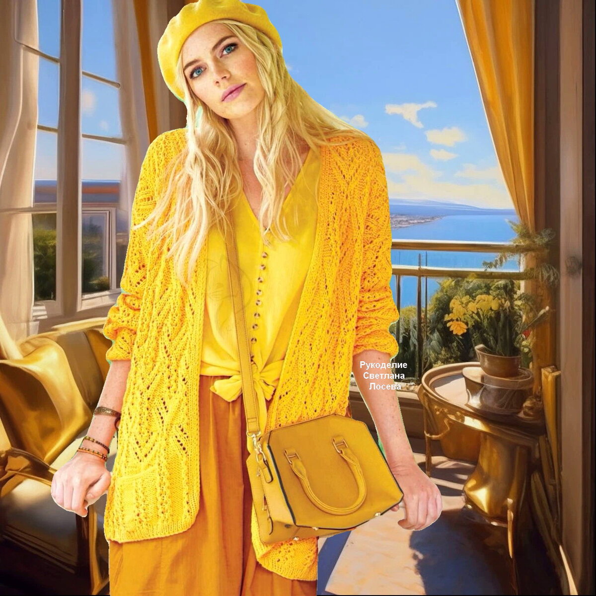 Яркий, как весеннее солнце, насыщенный желтый цвет этого кардигана напоминает о теплых днях и поднимает настроение. Замысловатый ажурный узор на ткани создает неповторимый рисунок, похожий на изящную паутину, которую соткал искусный мастер.