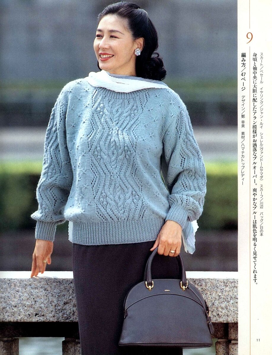 Джемпер с акцентом на кокетку и резинку. Смотрится очень аккуратно, ничего лишнего. Резинка из ромбов и чередование петель 1 лицевая, 1 изнаночная (кстати такой узор с ромбами мы с вами уже вязали). А вот кокетка на мой взгляд произведение искусств! Лучше всего такой джемпер вязать из тонкой пряжи, тогда он будет смотреться также. Модель №2