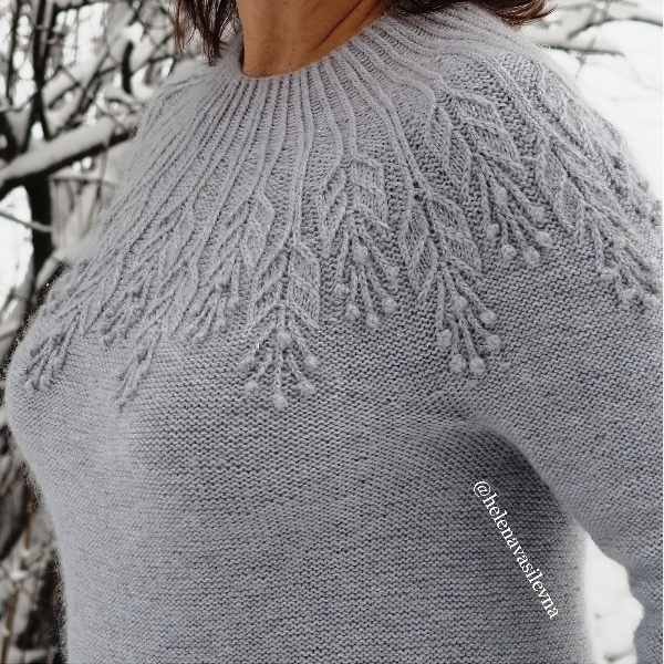 Этот джемпер меня покорил! Надеюсь я найду время связать и такой джемпер. И на прохладную весну он отлично подойдет. Можно связать из полушерсти и например ненавязчивого зеленого цвета, красного или сиреневого. Узор смотрится как веточки с ягодками и шишки в данной модели очень уместны.