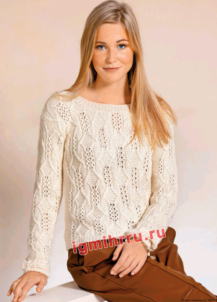 СВЕТЛЫЙ ПУЛОВЕР СО СКВОЗНЫМИ МОТИВАМИ. Вязание спицами