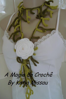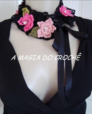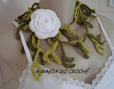 Olá amigas!! Olha eu, inventando moda novamente...rsrsrs. Mais um lançamento 2010. Agora com muitas rendas, pérolas, fitas e uma rosa em tecido leve...Crochê!! só nas folhas e em algumas correntinhas.