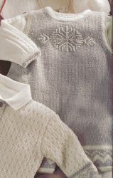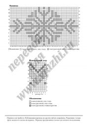 Вязание для новорожденного комбинезона спицами лицевой гладью, с жаккардовым узором в области ножек и вышивкой крестиком мотива снежинки на груди. Вяжем комбинезон для новорожденного Снежинка лицевой гладью с жаккардовым узором и вышивкой.Размер: 3 месяца, (6-9 месяцев, 12-18 месяцев). Подготовим материалы для вязания комбинезона:Нам потребуется детская пряжа Baby superwash от фирмы Bouton D’Or – 3 (3, 4) мотка жемчужного цвета 436 и 1 моток для всех размеров натурального цвета 380. Заменя эту пряжу другой, отдайте предпочтение именно детской пряже, которая будет более комфорта для новорожденного и не вызывать аллергию. Вязать комбинезон будем спицами № 3. Для отделочной обвязки краев комбинезона потребуется крючок № 3. 7 кнопок для застежки в области ножек. Перечислим используемые узоры и виды петель при вязании комбинезона для новорожденного Снежинка.Для вязания спицами будеми использовать такие распространенные узоры, как платочная вязка, лицевая гладь, резинка 1 на 1. Жаккардовый узор выполняется спицами по схеме лицевой гладью. Протяжка: 2 петли вместе лицевой с наклоном влево. Убавление одной петли в трех петлях от правого края: 3 лицевые петли, 2 петли вместе лицевой. Убавление одной петли в трех петлях от левого края: протяжка, 3 лицевые петли. Убавление одной петли в трех петлях от правого края горловины: протяжка, 3 лицевые петли. Убавление одной петли в трех петлях от левого края горловины: 3 лицевые петли, 2 петли вместе лицевой.