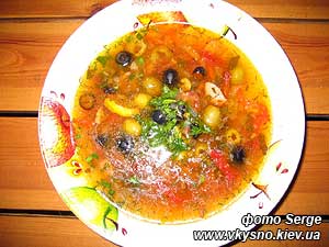 Перед подачей в тарелочку кладем оливочку, ломтик лимончика, сметанку, и наливаем солянку.