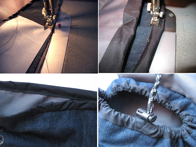 Я делаю кулиску из тонкой плащевки шириной 8см и длиной 76см: пришиваю к лицевой стороне, подгибаю внутрь и прострачиваю еще раз по лицу.