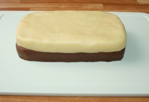 6. На темный пласт теста положить светлый, слегка прижать и положить в холодильник на 30–40 минут.