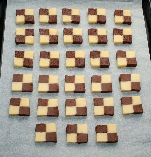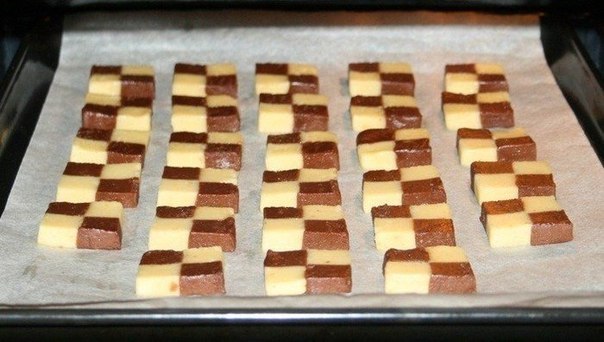 10. Брусочки из теста нарезать на кусочки шириной 1 см. Противень застелить пекарской бумагой, выложить заготовки печенья. Выпекать печенье в духовке при температуре 180 – 190 градусов 10-15 минут (в зависимости от духовки).