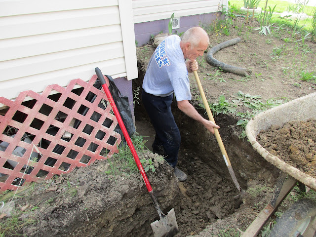 Совсем скоро будем копать и бетонировать, чтоб передвинуть 2 стены дома: передний простенок на 70 см, а боковую стену(целиком)-на 95 см. Поэтому земли на те места недосыпали.