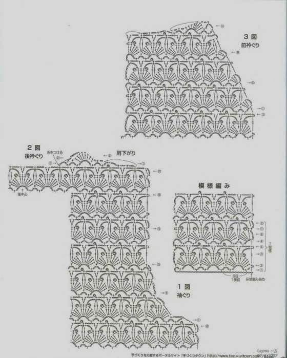 Описание работы: Набрать цепочку из 120 воздушных петель и по схеме вязать узором, чередуя 2-й и 3-й ряд. На высоте 2 метра закончить вязание.