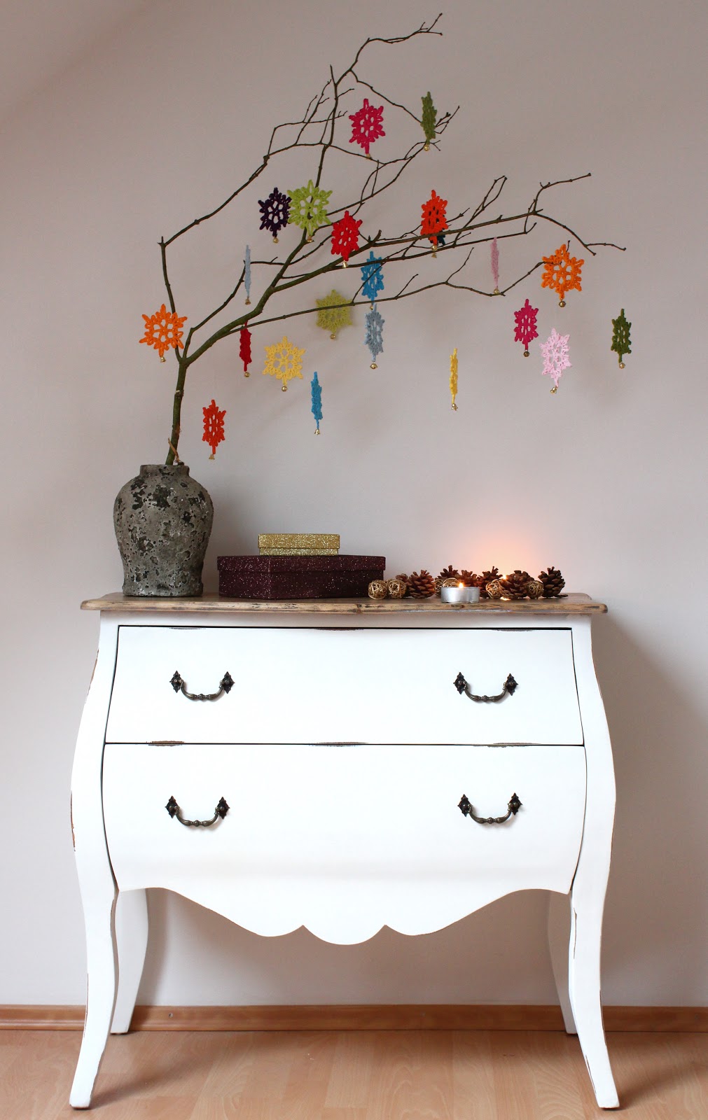 Round 3: Ch 4, *1 dc in ch 8 sp, ch 15, 1 tr in next ch 8 sp. Ch 11, sl st in 2nd ch from hook, in the following ch: 1 sc, 1 hdc, 1 dc, 1 tr. Ch 6, sl st in 2nd ch from hook, in the following ch: 1 sc, 1 hdc, 1 dc, 1 tr. Ch 6, sl st in 2nd ch from hook, in the following ch: 1 sc, 1 hdc, 1 dc, 1 tr, in the remaining ch: 1 tr, 1 dc, 1 hdc, 1 sc, sl st. 1 tr in same ch 8 sp. Ch 15. 1 dc in next ch 8 sp, 1 tr in tr from round 2*. Repeat from * to * around. End with sl st in 4th ch of the first ch 4.