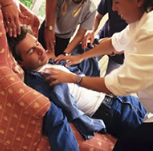 Некоторые начинают считать пульс у пострадавшего. Пульс редкий и слабый, руки холодные, а мышцы расслаблены. Дыхание поверхностное, едва заметное. Кто-то вызывает скорую помощь... Больного переносят в соседнюю комнату, ищут валерианку.