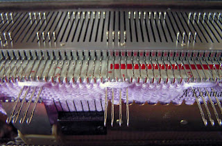 - провязаваю ряд кареткой до перекреста петель (остальные иглы стоят в ПНП, рычаг част. вязания включен),