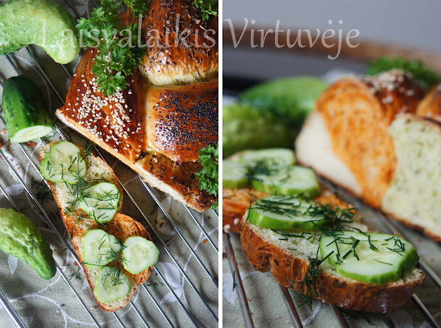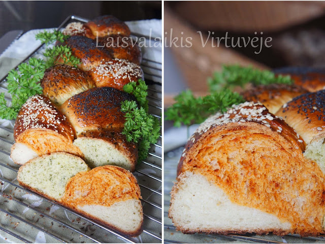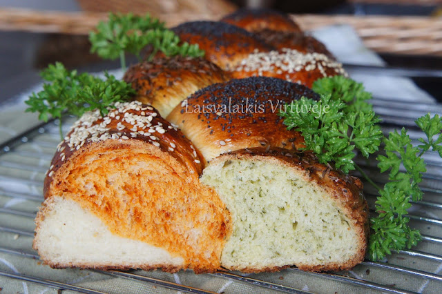 Поднявшуюся плетенку смазать смесью желтка и молока. Ту часть в которую добавлена паприка посыпать сезамом, с петрушкой - тмином, а где без ничего - маком.